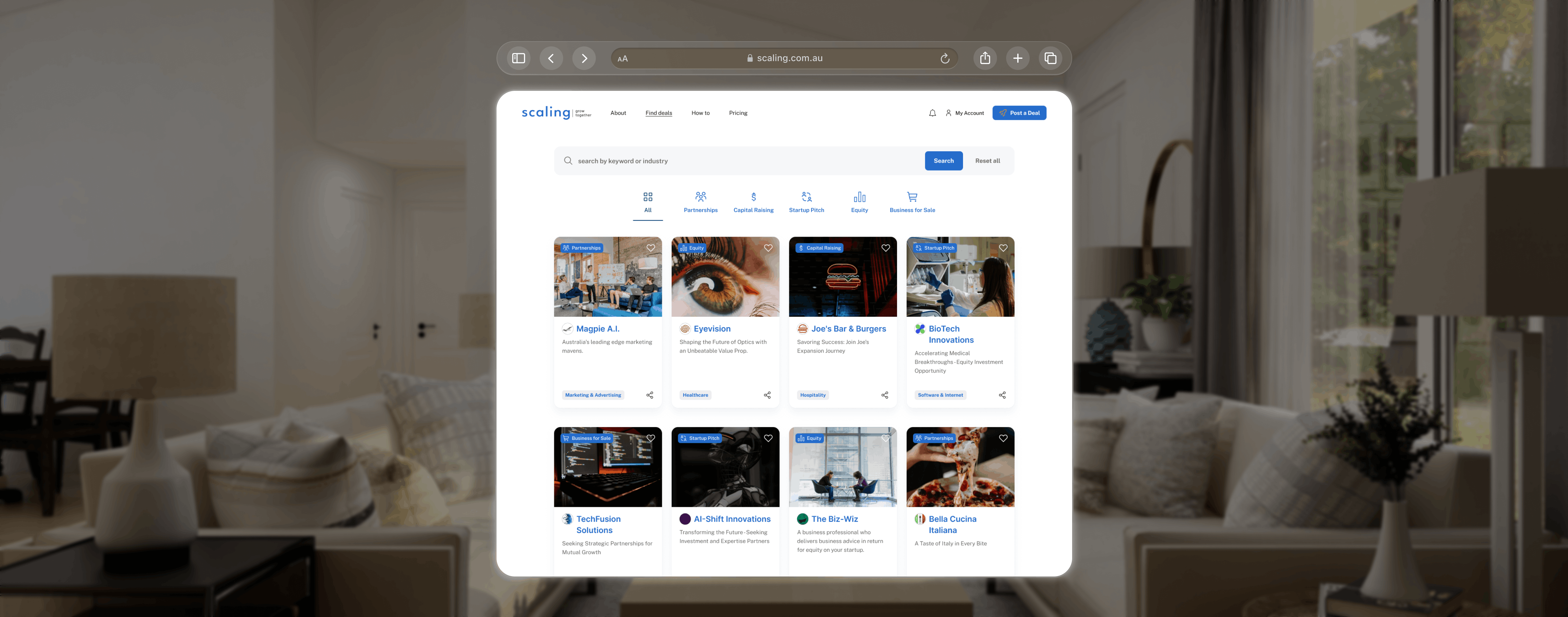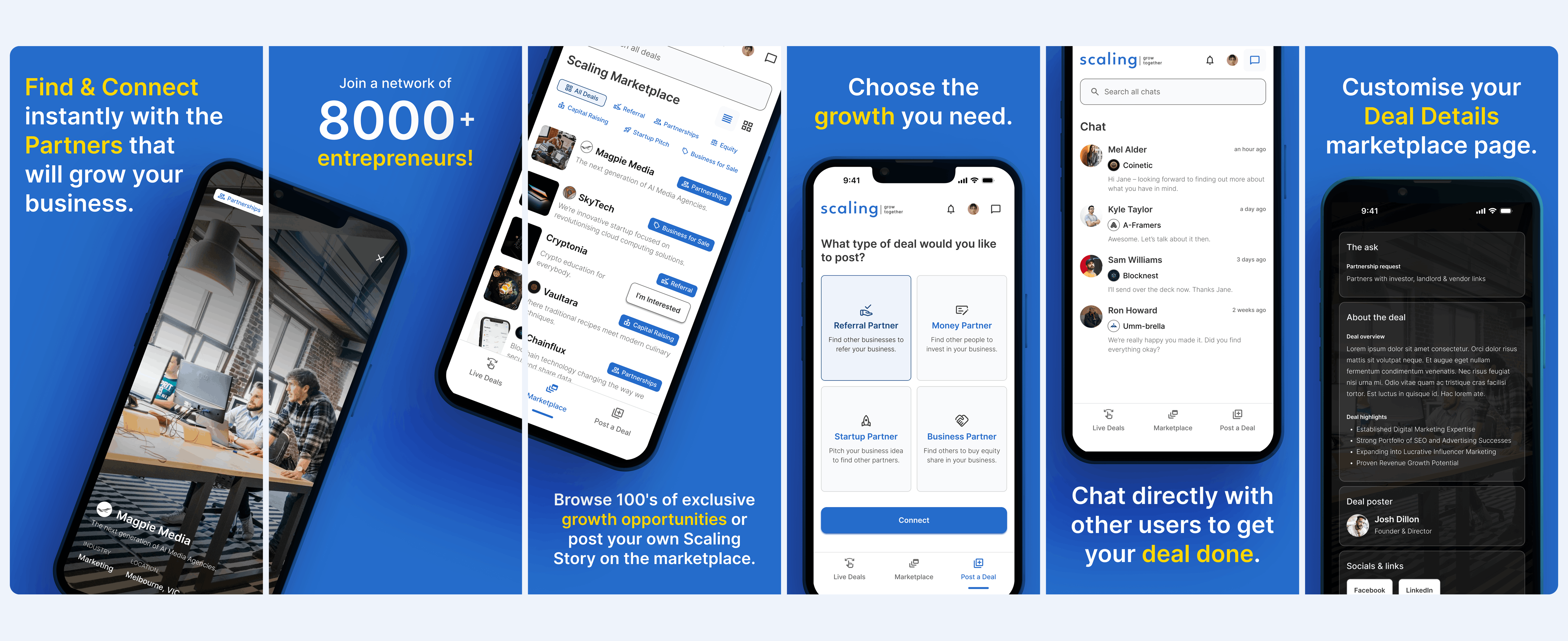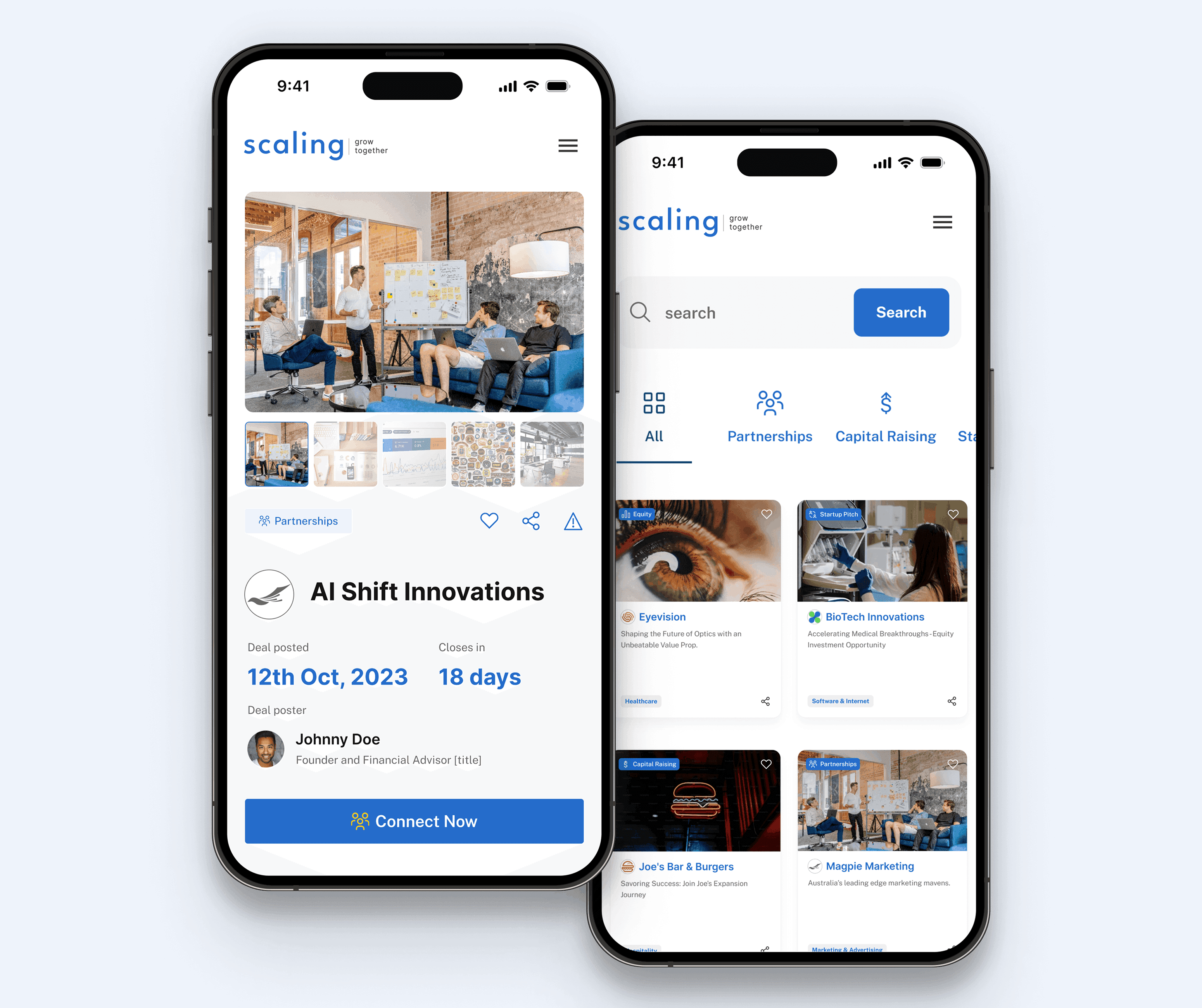 Scaling is a digital marketplace designed to connect entrepreneurs, investors, and business owners — helping them find the right partners to grow and scale their ventures. The platform enables users to raise capital, form partnerships, pitch ideas, and buy or sell businesses, creating a central hub for collaboration and opportunity. Introduced to the founders through an industry connection, SuperKind was brought on to shape both the brand identity and digital product, guiding the concept from early idea through to MVP and launch.